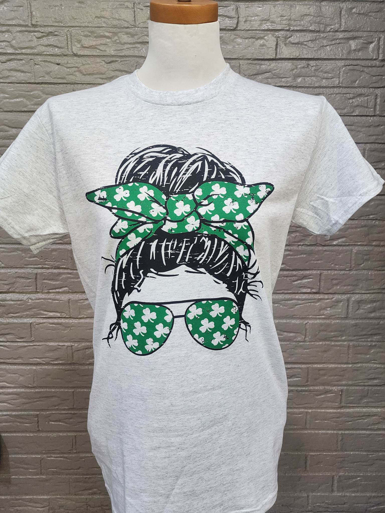 This St. Patrick's Day t-shirt is perfect for those who want to celebrate the holiday in style. The shirt features a bold and edgy grunge design of a mother wearing a green bandana and shades with clovers on them. The bandana and shades give the design a cool and casual look, while the clovers bring a sense of fun and festivity. The image of a mom wearing a bandana and shades gives a nod to the idea of a cool, modern mom celebrating St. Patrick's day. The use of a grunge style gives the design an edgy and unique look that is sure to stand out. Made from soft and breathable cotton, this shirt is comfortable to wear and perfect for St. Patrick's Day celebrations or for showing off your festive spirit. Whether you're at a parade or a party, this shirt is sure to make a statement.